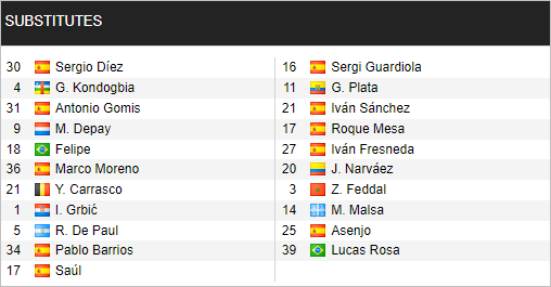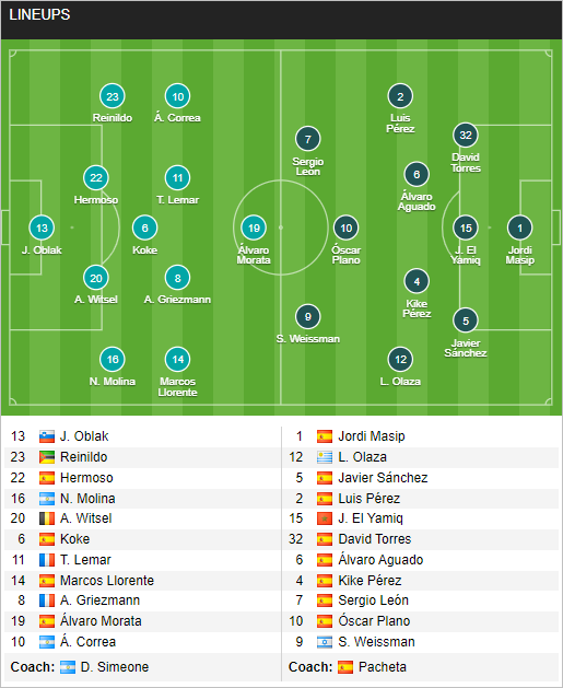 Atletico Madrid: Oblak, Molina, Hermoso, Felipe, Reinildo, Llorente, De Paul, Kondogbia, Barrios, Morata, Griezmann