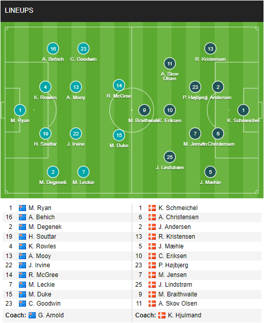 AEGoal cập nhật chính xác ĐỘI HÌNH RA SÂN trận Australia vs Đan Mạch diễn ra lúc 22h00 ngày 30/11 trong khuôn khổ World Cup 2022.