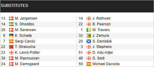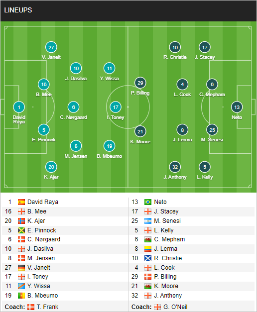 Brentford: Raya; Zanka, Ben Mee, Pinnock; Roerslev, Norgaard, Vitaly Janelt, Mathias Jensen, Rico Henry; Bryan Mbeumo, Yoane Wissa.