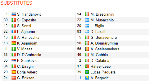 - Inter Milan: Vắng Roberto Gagliardini, Samir Handanovic, Borja Valero (chấn thương), Alessandro Bastoni và Lautaro Martinez (treo giò).