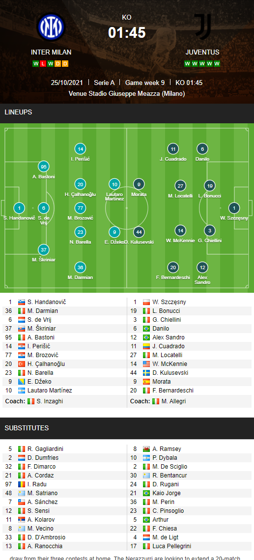 AEGoal cập nhật chính xác ĐỘI HÌNH RA SÂN trận Inter Milan vs Juventus diễn ra lúc 01h45 ngày 25/10 trong khuôn khổ giải VĐQG Italia.