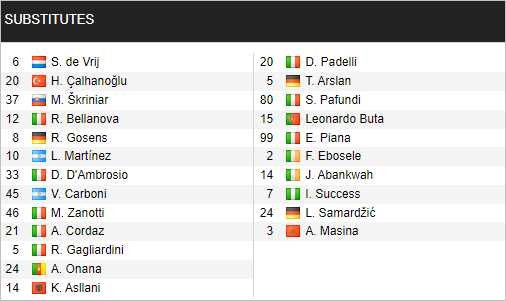 * Danh sách dự bị trận Inter Milan vs Udinese (02h45 ngày 19/2)