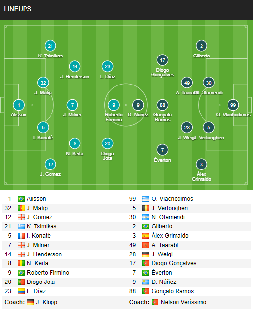Liverpool : Alisson; Alexander-Arnold, Konate, Van Dijk, Robertson; Keita, Fabinho, Jones; Salah, Firmino, Diaz