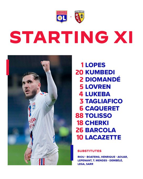 Lyon: Lopes; Kumbedi, Diomande, Lovren, Tagliafico; Lepenant, Tolisso, Caqueret; Cherki, Barcola, Lacazette