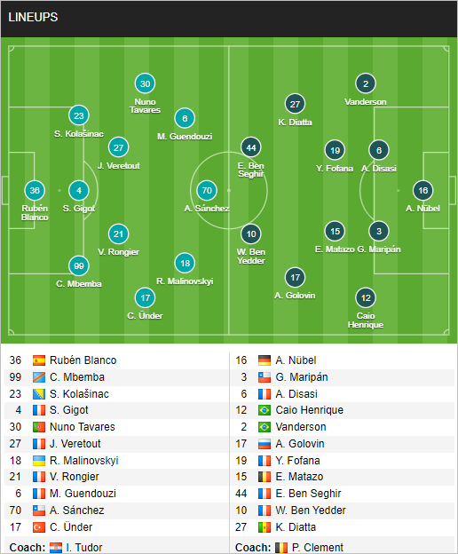 Marseille: Lopez; Mbemba, Gigot, Kolasinac; Under, Rongier, Veretout, Malinovskyi; Guendouzi; Sanchez, Dieng