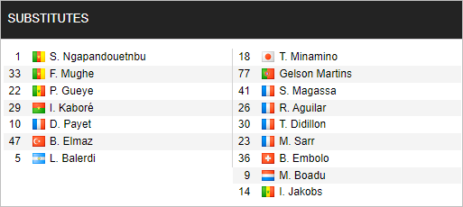 Monaco: Nubel; Vanderson, Disasi, Maripan, Henrique; Fofana; Diatta, Ben Seghir, Golovin; Ben Yedder, Embolo