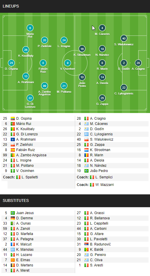 AEGoal cập nhật chính xác ĐỘI HÌNH RA SÂN trận Napoli vs Cagliari diễn ra lúc 01h45 ngày 27/9 trong khuôn khổ giải VĐQG Italia.