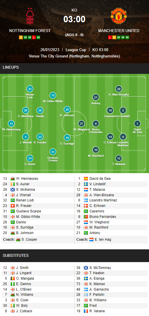 AEGoal cập nhật chính xác ĐỘI HÌNH RA SÂN trận Nottingham Forest vs Man Utd diễn ra lúc 03h00 ngày 26/01/2023 trong khuôn khổ Cúp Liên Đoàn Anh.