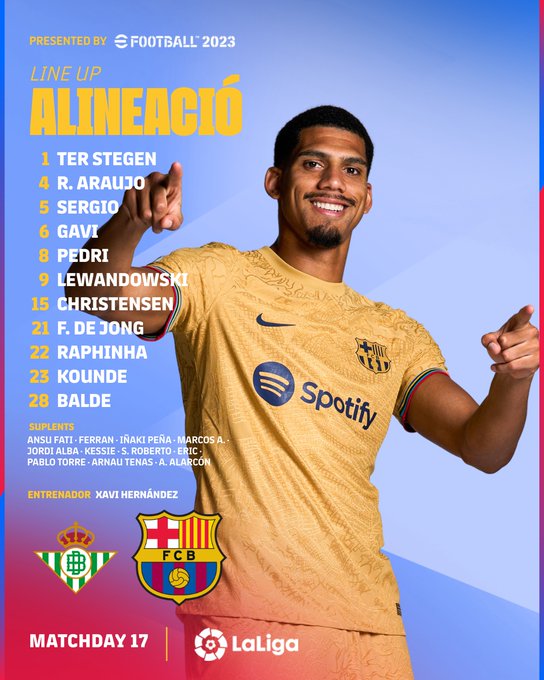 AEGoal cập nhật chính xác ĐỘI HÌNH RA SÂN trận Real Betis vs Barcelona diễn ra lúc 03h00 ngày 02/02/2023 trong khuôn khổ Cúp Liên đoàn Anh.