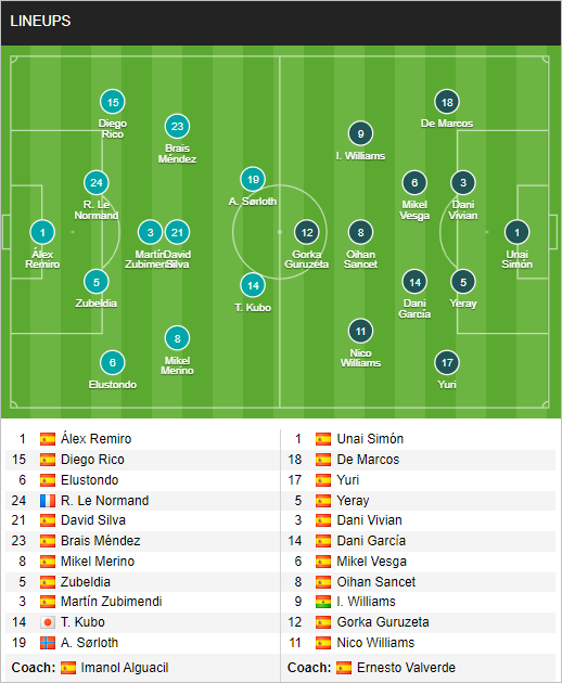 Sociedad: Remiro; Elustondo, Zubeldia, Le Normand, Rico; Mendez, Zubimendi, Merino; D Silva; Sorloth, Oyarzabal