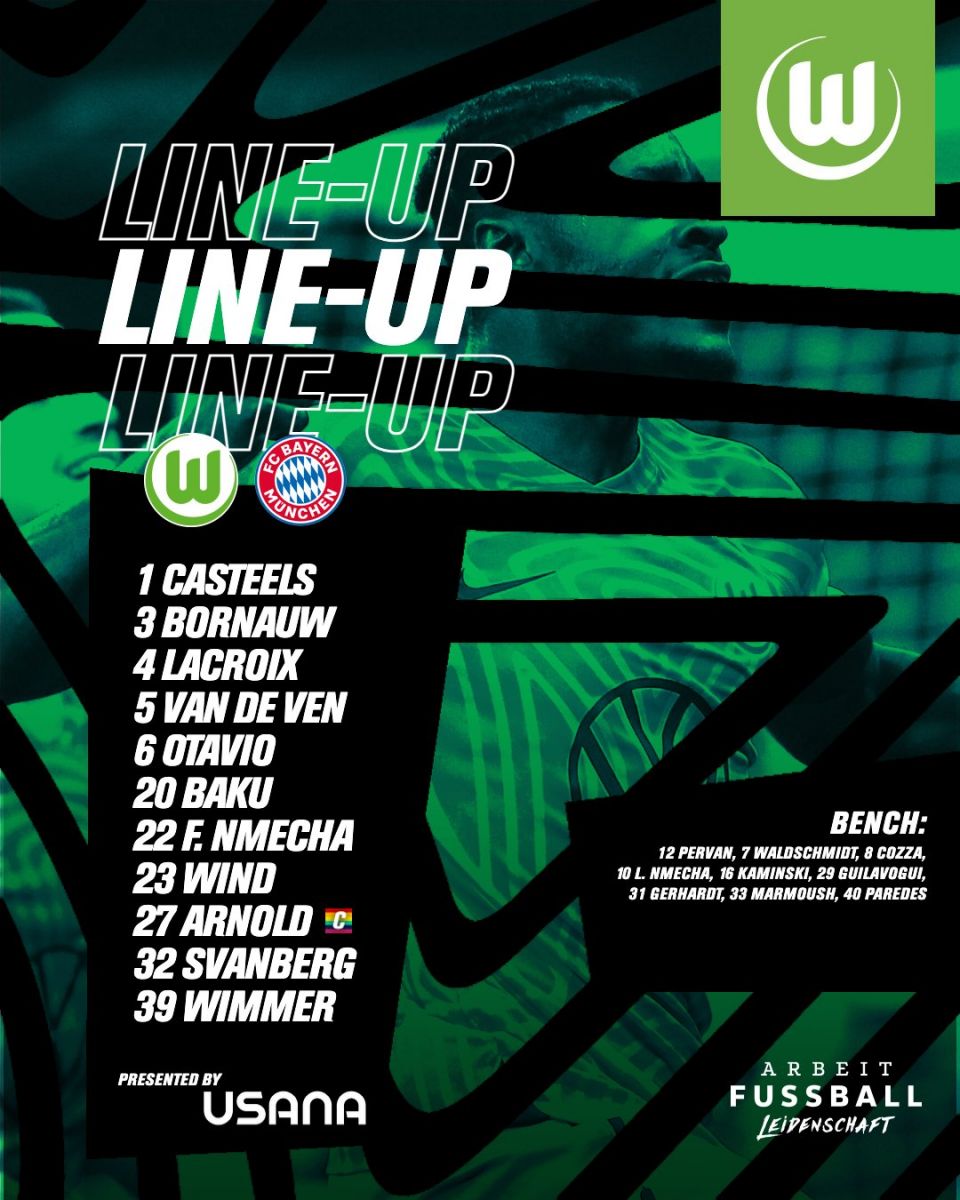 Wolfsburg: Casteels; Baku, Bornauw, Van de Ven, Otavio; F. Nmecha, Arnold, Gerhardt; Wimmer, Wind, Kaminski