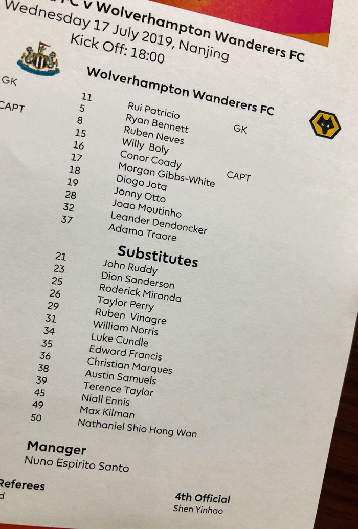 - Wolves: Ruddy, Sanderson, Miranda, Perry, Vinagre, Norris, Cundle, Francis, Marques, Samuels, Taylor, Ennis, Kilman, Hong Wan.