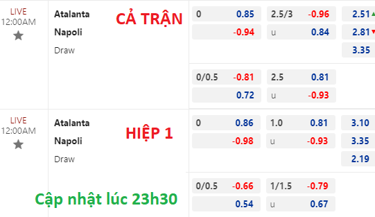 Chốt kèo trực tiếp trận Atalanta vs Napoli (0h00):