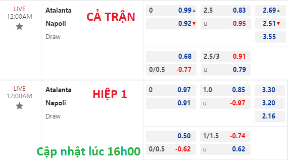 Kèo chính vẫn là 0:0 nhưng điểm ăn cho cửa Atalanta giảm đáng kể. Mức tài xỉu 2 1/2 cũng dần được nhích lên thành 2 3/4 mang đến hy vọng về kịch bản mở.
