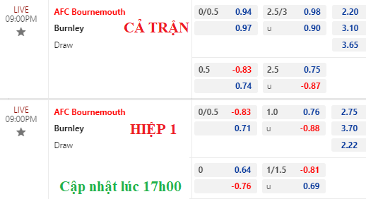 Tỷ lệ chính vẫn ở mức Bournemouth chấp đồng banh với lợi nhuận khá cân bằng giữa các lựa chọn. Trong khi đó thì tài xỉu 2 1/2 có điểm ăn thấp hơn ở lựa chọn tài. Với 1 trận cầu có sự tham gia của Burnley, cột mốc tài xỉu như vậy không phải là thấp. Đôi bên đều chơi phòng ngự lỏng lẻo thời gian qua, điều đó mang đến hy vọng về cửa tài.