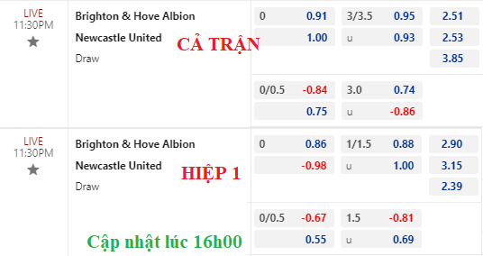 Trên sàn châu Á, tỷ lệ vẫn là 0:0 và điểm ăn cho cửa Brighton xuống thấp hơn trong khi tài xỉu giữ nguyên. Dịch chuyển handicap như vậy mang đến sự tin tưởng vào chủ nhà.