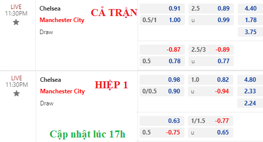Grealish tiếp tục ngồi ghế dự bị để Doku đá chính cùng Haaland, Foden và Julian Alvarez của đội khách. Nhìn chung, Man City đang có được chiều sâu đội hình để có thể mang lại bất ngờ dành cho Chelsea. Chỉ số trên sàn giao dịch châu Á đang là sự ổn định với kèo chấp 3/4 của Man City cùng lợi điểm cân bằng giữa các lựa chọn đối lập đã tồn tại suốt từ đầu phiên đến sát giờ bóng lăn.