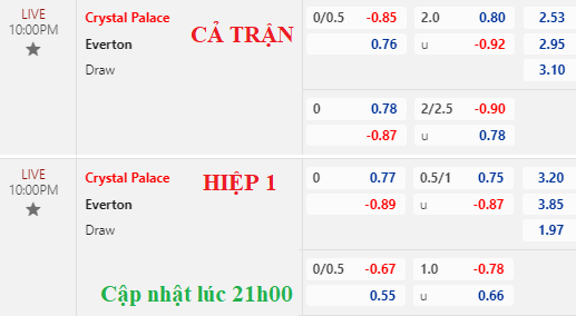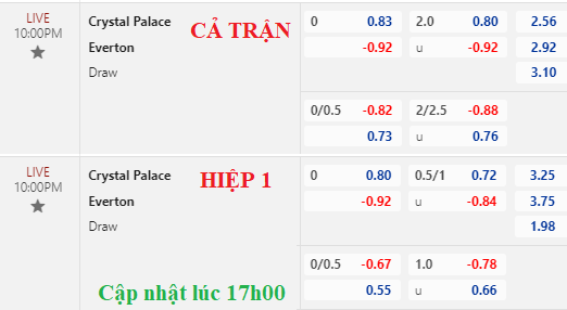 Kèo châu Á Crystal Palace chấp dao động giữa mức giá và 1/4, tỷ lệ chưa khả quan trong bối cảnh họ được chơi trên sân nhà. Crystal Palace cũng thiếu đi sức bật về tỷ lệ. Trong khi đó, tài xỉu vẫn chỉ là 2 hòa dù lợi nhuận cho cửa tài thấp. Thực tế Crystal Palace cũng không có nhiều nhân tố đáng tin ở đội hình xuất phát.