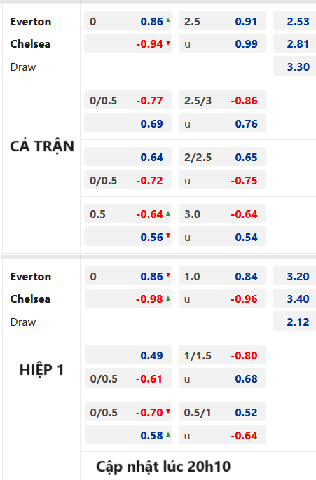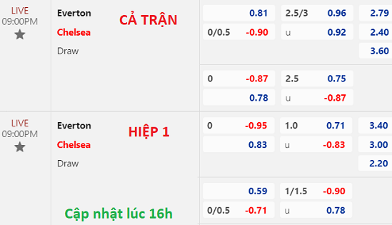 Khá nhiều xáo trộn ở đội hình xuất phát của Chelsea như Silva, Sterling, Jackson đều bị đẩy lên băng ghế dự bị. Đội khách vì thế chứng kiến đà sụt giảm đáng kể trên sàn giao dịch châu Á. Kèo chính đã bị điều chỉnh về mức 0:0 khi Everton đã tăng hơn 1/4 quả bóng. Cùng với đó là kèo bàn thắng cũng tụt xuống từ định mức 2 3/4 hồi đầu phiên xuống còn 2 1/2 vào lúc bóng chuẩn bị diễn ra. Đây rõ ràng là những chi tiết cho thấy kịch bản tưng bừng bàn thắng rất khó xảy ra.