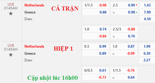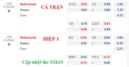 Chốt kèo trực tiếp trận Hà Lan vs Hy Lạp (01h45):