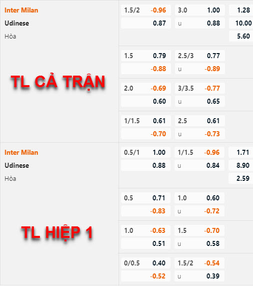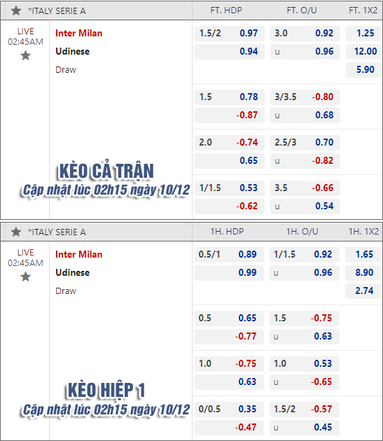 * Chốt kèo trận Inter Milan vs Udinese (02h45 ngày 10/12)