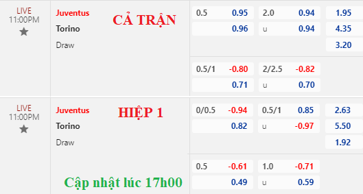 Chốt kèo trực tiếp trận Juventus vs Torino (23h00):