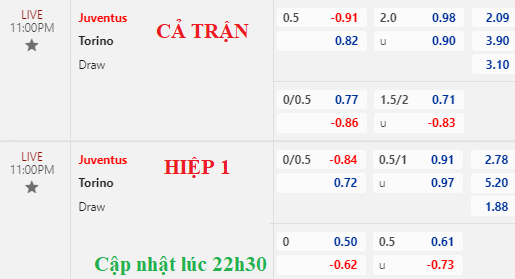Vlahovic vắng mặt và Milik cũng dự bị, M.Kean được lựa chọn đá mũi nhọn. Phía đối diện, Torino chơi 3-4-2-1 với Zapata là tiền đạo cắm. Với đội hình như vậy, không bất ngờ khi Juventus mất giá. Kèo chấp hòa của "lão bà" tiến đến mức bỏ sâu trong khi tài xỉu vẫn ở mức thấp. Rất khó để tin vào Juventus ở thời điểm hiện tại, đặc biệt với đội hình xuất phát như vậy.