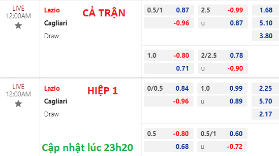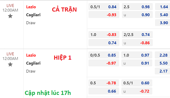 Chốt kèo trực tiếp trận Lazio vs Cagliari (0h00):