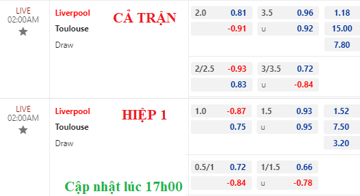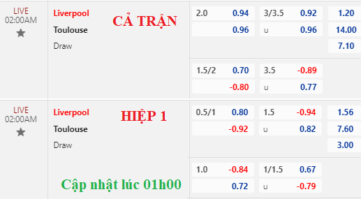 Trên sàn châu Á, Liverpool vẫn chấp 2 hòa nhưng lợi nhuận đã tăng đáng kể. Mức tài xỉu 3 1/2 bị kéo về chỉ còn 3 1/4. Việc Toulouse chủ động đá phòng ngự sẽ khiến trận cầu này khó xuất hiện sự tưng bừng.