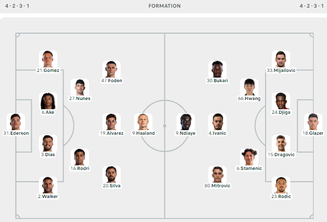 Man City (4-2-3-1): Ederson; Walker, Dias, Akanji, Ake; Nunes, Rodri; Foden, Silva, Alvarez; Haaland.