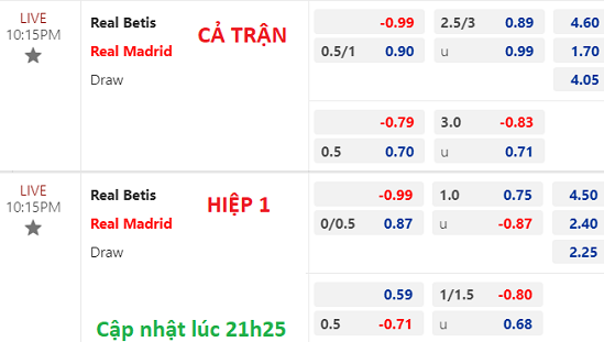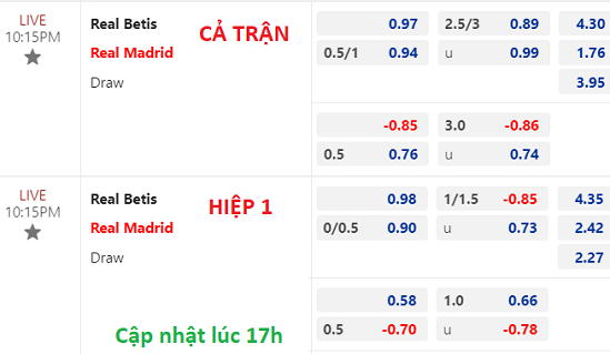 Chốt kèo trực tiếp trận Real Betis vs Real Madrid (22h15):