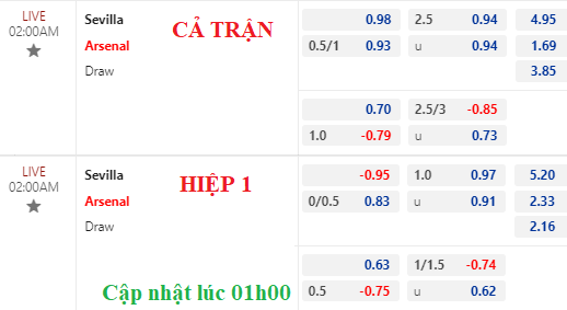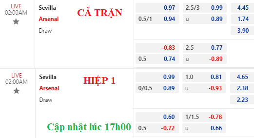 AEGoal chốt kèo bóng đá trực tiếp trận Sevilla vs Arsenal diễn ra lúc 2h00 ngày 25/10 trong khuôn khổ Cúp C1 châu Âu sau khi dựa trên tính toán, chuyển động về kèo châu Á và đội hình ra sân của 2 đội.