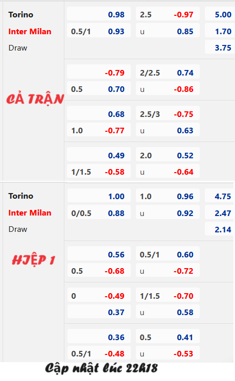 AEGoal chốt kèo bóng đá trực tiếp trận Torino vs Inter Milan diễn ra lúc 23h00 ngày 21/10 trong khuôn khổ giải VĐQG Italia sau khi dựa trên tính toán, chuyển động về kèo châu Á và đội hình ra sân của 2 đội.
