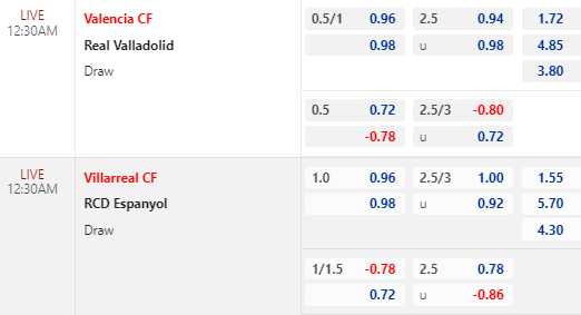 * Villarreal vs Espanyol: Kèo chính "tàu ngầm vàng" vẫn chấp 1 hòa nhưng điểm ăn còn cao hơn so với thời điểm chiều nay. Trong khi đó thì tài xỉu vẫn là 2 3/4 với lợi nhuận không xê dịch đáng kể. Được chơi trên sân nhà trước đối thủ đang xếp áp chót, kém nhiều bậc nhưng Villarreal thiếu sức bật là điều đáng lo ngại về cửa trên.
