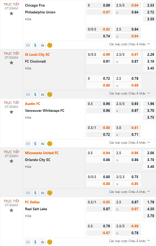 * Chicago Fire vs Philadelphia Union: Mặc dù phong độ tốt hơn và lại có ưu thế sân nhà nhưng Chicago Fire thiếu đi sức bật. Kèo chấp 1/4 của họ cũng không phải tỷ lệ khả quan khi có lợi nhuận bỏ sâu.