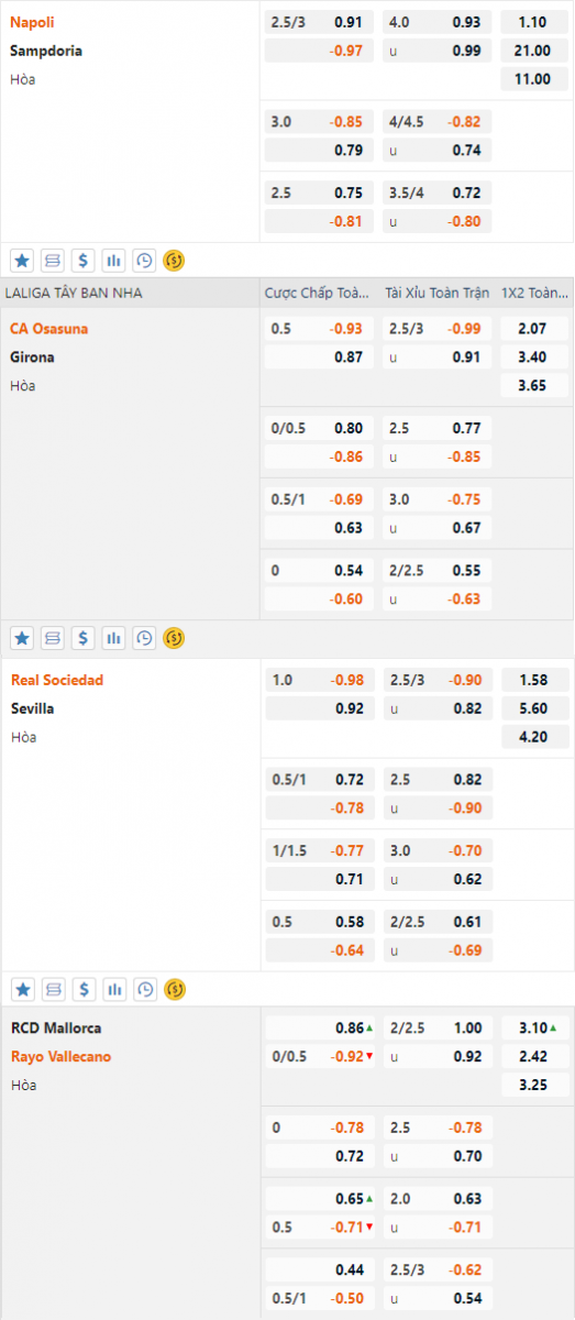 Tỷ lệ chấp của đội chủ nhà tiếp túc tăng điểm thời gian vừa. Hiện tại Napoli có tỷ lệ chấp chính 2 3/4 thay cho mức 2 1/4 ở lần chúng tôi cập nhật trước. Với mức chấp này thì lựa chọn cửa dưới là tương đối hiểm