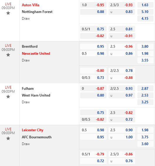 * Aston Villa vs Nottingham: Phong độ cao và được chơi trên sân nhà nhưng Aston Villa không có sức bật về tỷ lệ. Kèo chấp 1 hòa của họ vẫn bỏ sâu và đáng nói là tỷ lệ hiệp 1 Aston Villa chỉ chấp đồng banh càng cho thấy cửa trên không sáng giá.