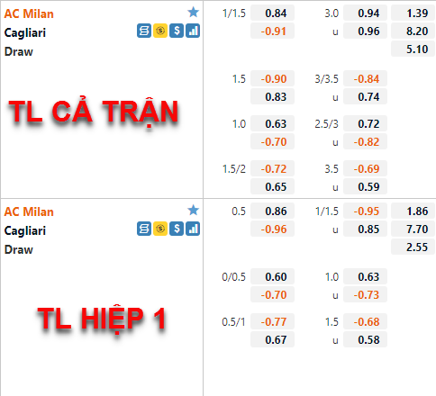 AC Milan nhận được nhiều tín hiệu tích cực khi kèo chấp 1 1/4 của họ đã được điều chỉnh lên thành chấp 1 1/2 với điểm ăn thấp. Trong khi đó thì mức tài xỉu vẫn là 3 hòa nhưng lợi nhuận cho cửa tài cũng giảm đáng kể.