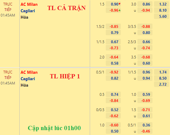 AEGoal chốt kèo bóng đá trực tiếp trận AC Milan vs Cagliari diễn ra lúc 01h45 trong khuôn khổ giải VĐQG Italia sau khi dựa trên tính toán, chuyển động về kèo châu Á và đội hình ra sân của 2 đội.
