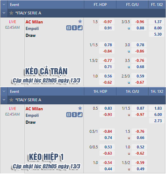AEGoal chốt kèo bóng đá trực tiếp trận AC Milan vs Empoli diễn ra lúc 02h45 ngày 13/3 trong khuôn khổ giải VĐQG Italia sau khi dựa trên tính toán, chuyển động về kèo châu Á và đội hình ra sân của 2 đội.