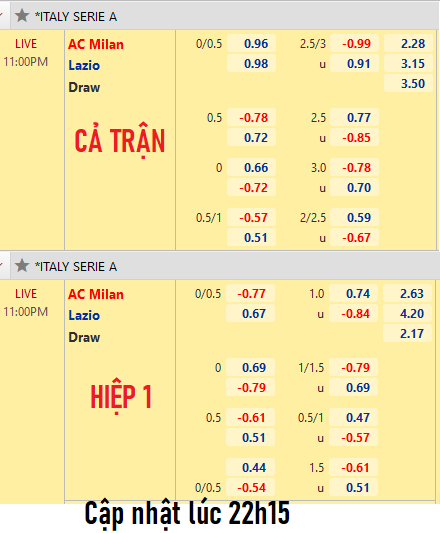 AEGoal chốt kèo bóng đá trực tiếp trận AC Milan vs Lazio diễn ra lúc 23h00 ngày 12/9 trong khuôn khổ giải VĐQG Italia sau khi dựa trên tính toán, chuyển động về kèo châu Á và đội hình ra sân của 2 đội.