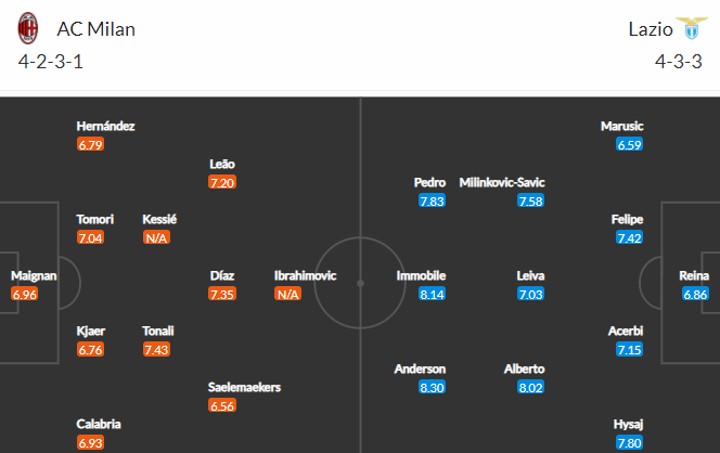 AC Milan: Maignan; Calabria, Kjaer, Tomori, Theo Hernandez; Tonali, Kessie; Florenzi, Brahim Diaz, Leao; Rebic.
