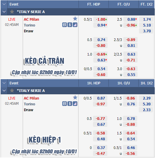 * Chốt kèo trận AC Milan vs Torino (02h45 ngày 10/01)