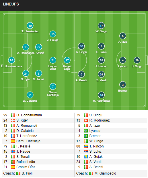 - AC Milan: Gabbia, Saelemaekers, Ibrahimovic, Bennacer, Rebic, Krunic vắng mặt vì chấn thương.