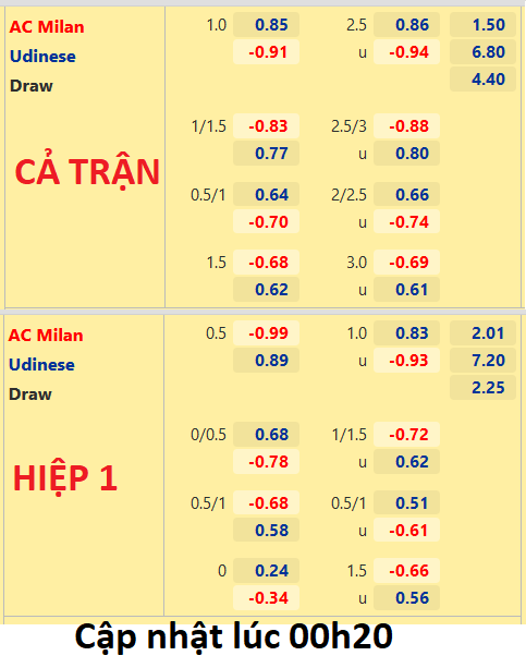 AEGoal chốt kèo bóng đá trực tiếp trận AC Milan vs Udinese diễn ra lúc 00h45 ngày 26/2 trong khuôn khổ giải VĐQG Italia sau khi dựa trên tính toán, chuyển động về kèo châu Á và đội hình ra sân của 2 đội.