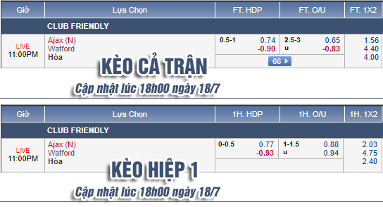 AEGoal.net chốt kèo trực tiếp trận Ajax vs Watford diễn ra lúc 23h00 ngày 18/7 sau khi dựa trên tính toán, chuyển động về kèo châu Á và đội hình ra sân của 2 đội.