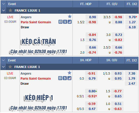 * Chốt kèo trận Angers vs PSG (03h00 ngày 17/1)