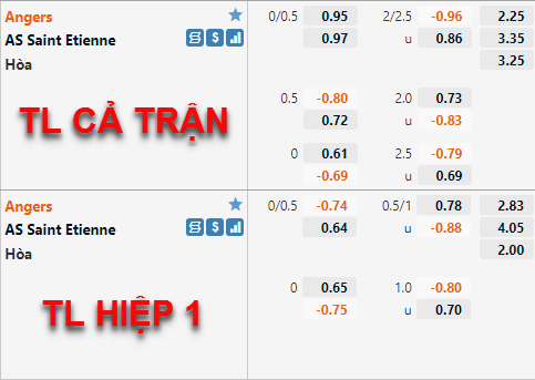 Angers vẫn đang được nhà cái châu Á đánh giá ở cửa trên với tỷ lệ chấp 1/4 như thời điểm chúng tôi cập nhật trước đây, hiện tại điểm ăn của đội chủ nhà còn được điều chỉnh giảm so với trước đây. Bên phía tỷ lệ tài xỉu cũng có những diễn biến thuận chiều khi mốc 2 1/4 vẫn được giữ như trước nhưng điểm ăn của cửa tài đang có xu hướng giảm điểm.