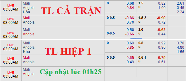Kèo chấp 1/4 của Mali ở thời điểm phiên giao dịch trưa ngày 02/07 đã có dịch chuyển về giá theo hướng thiếu tích cực với Mali. Nếu như trưa ngày 02/07 họ chấp 1/4 với điểm ăn thấp (0.79) thì cũng với mức chấp đó, lợi nhuận cho cửa Mali đã bỏ sâu (-0.86). Ở mốc tài xỉu, mức 1 3/4 cũng được kéo xuống chỉ còn 1 1/2.