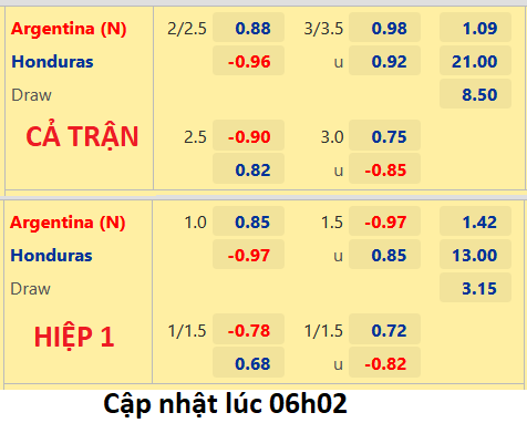 Mặc dù vẫn xuất phát với đội hình rất mạnh nhưng Argentina lại có diễn biến đáng ngại trên sàn giao dịch châu Á. Kèo chấp 2 1/2 hồi đầu phiên đã bị điều chỉnh xuống còn chấp 2 1/4 khi trận đấu chuẩn bị diễn ra. Cùng với đó là số bàn thắng cả trận bị đẩy xuống từ 3 1/2 còn 3 1/4 trước giờ bóng lăn. Đây rõ ràng là tín hiệu đáng lưu ý dành cho giới đầu tư nhưng cần biết rằng thời điểm hiện tại các cầu thủ Argentina đang cạnh tranh cho suất đá chính tại World Cup 2022 sắp tới nên tinh thần của đại diện Nam Mỹ được đảm bảo.